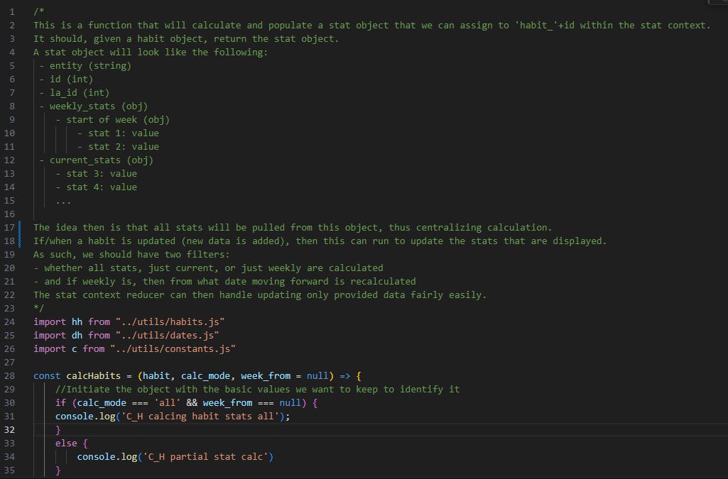 To make matters (much) worse, many of those functions were then called in over a dozen different places: the habit page, the graph, the home page’s habit cells, and more.