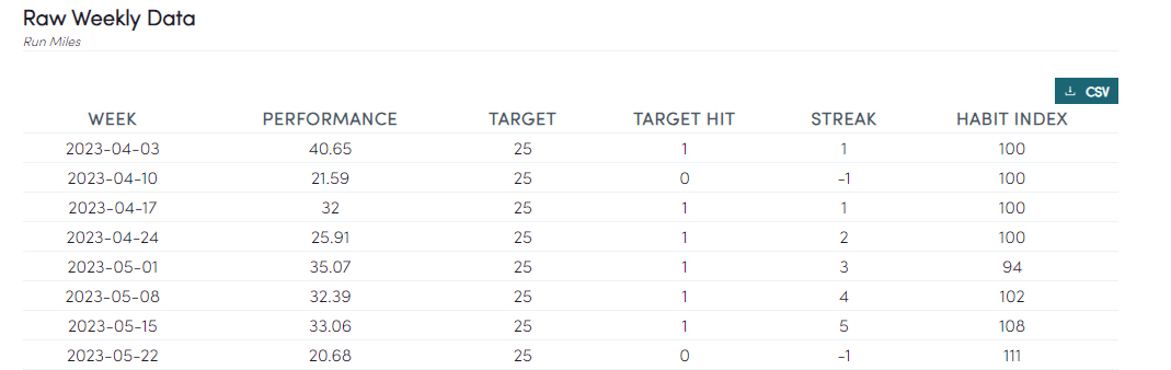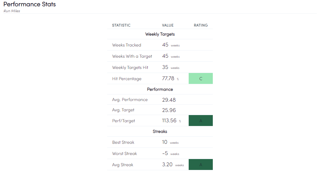 Along with that, we kept track of your streak of weeks hit or missed: so we’d be at 10 weeks currently, but had a -5 streak back in August (Texas Summers, what are you going to do?).